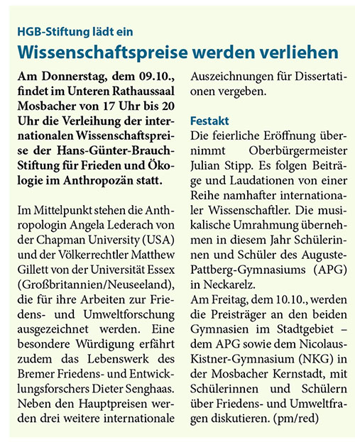 Zum ersten Mal verleihen die Hans-Günter-Brauch-Stiftung für Frieden und Ökologie und die Stadt Mosbach Schülerpreise (RNZ/StM/HGBS, Rhein-Neckar-Zeitung, Mosbacher Ausgabe, 25. Mai 2022, S.3).