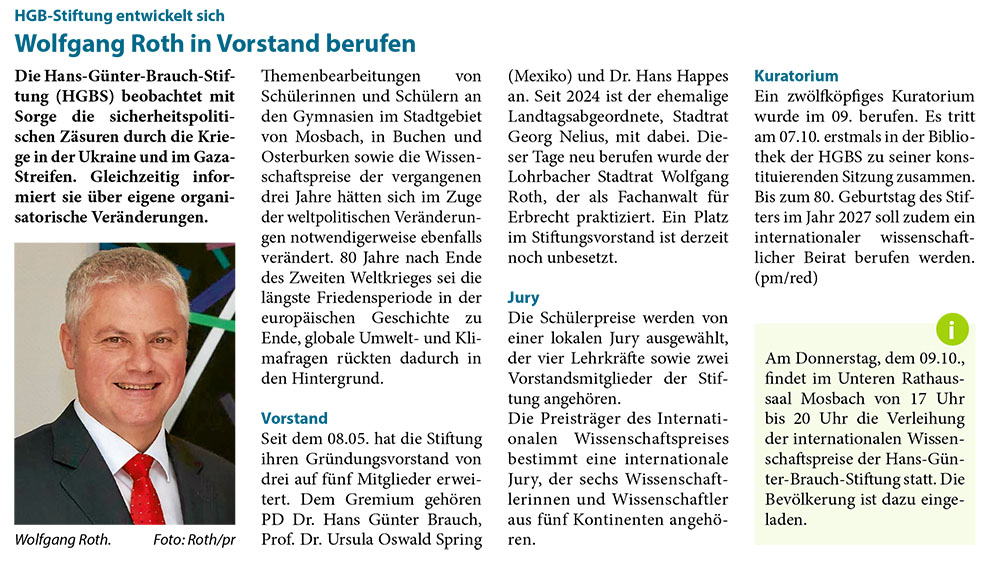 Quelle: HGB-Stiftung entwickelt sich: Wolfgang Roth in Vorstand berufen, Stadt-Anzeiger, 18 September 2025 No. 38, S. 13.