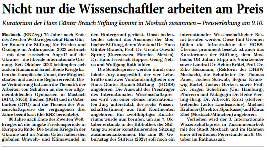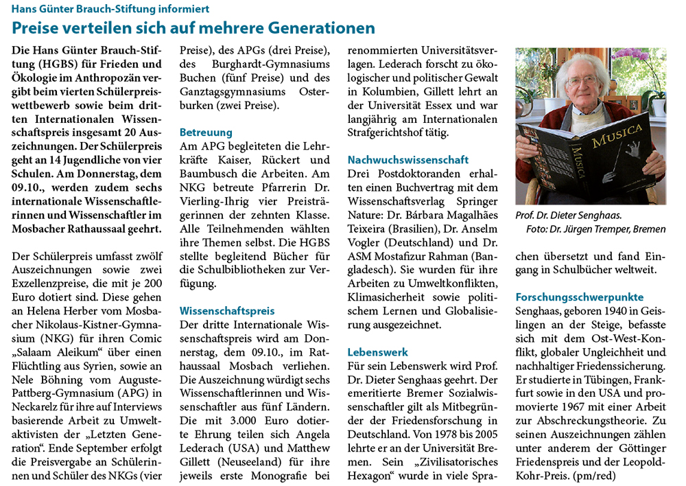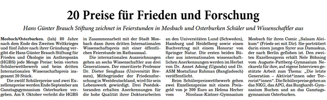 | Quelle: (lah.) “20 Preise für Frieden und Forschung”, in: Rhein-Neckar-Zeitung, Region Mosbach, Dienstag, 2. September 2025, S. 5: |