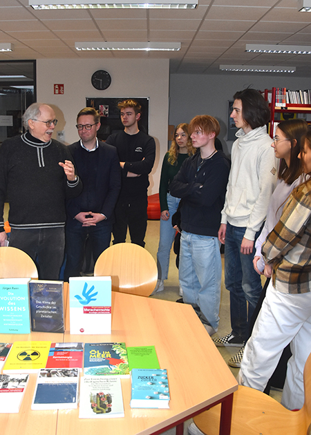 „Unser Ziel ist es, euch mit geistiger Nahrung zu versorgen“, rief PD Dr. Hans Günter Brauch, Begründer der gleichnamigen Stiftung (HGBS), den Schülerinnen und Schülern zu, die ihn zur Übergabe einer umfangreichen Buchspende empfingen. Begleitet wurde der Stifter durch den ehemaligen Schulleiter Hans Happes als Mitglied des Stiftungsvorstands. Ebenfalls war Mosbachs Oberbürgermeister Julian Stipp gekommen.