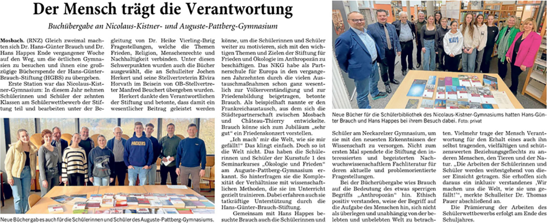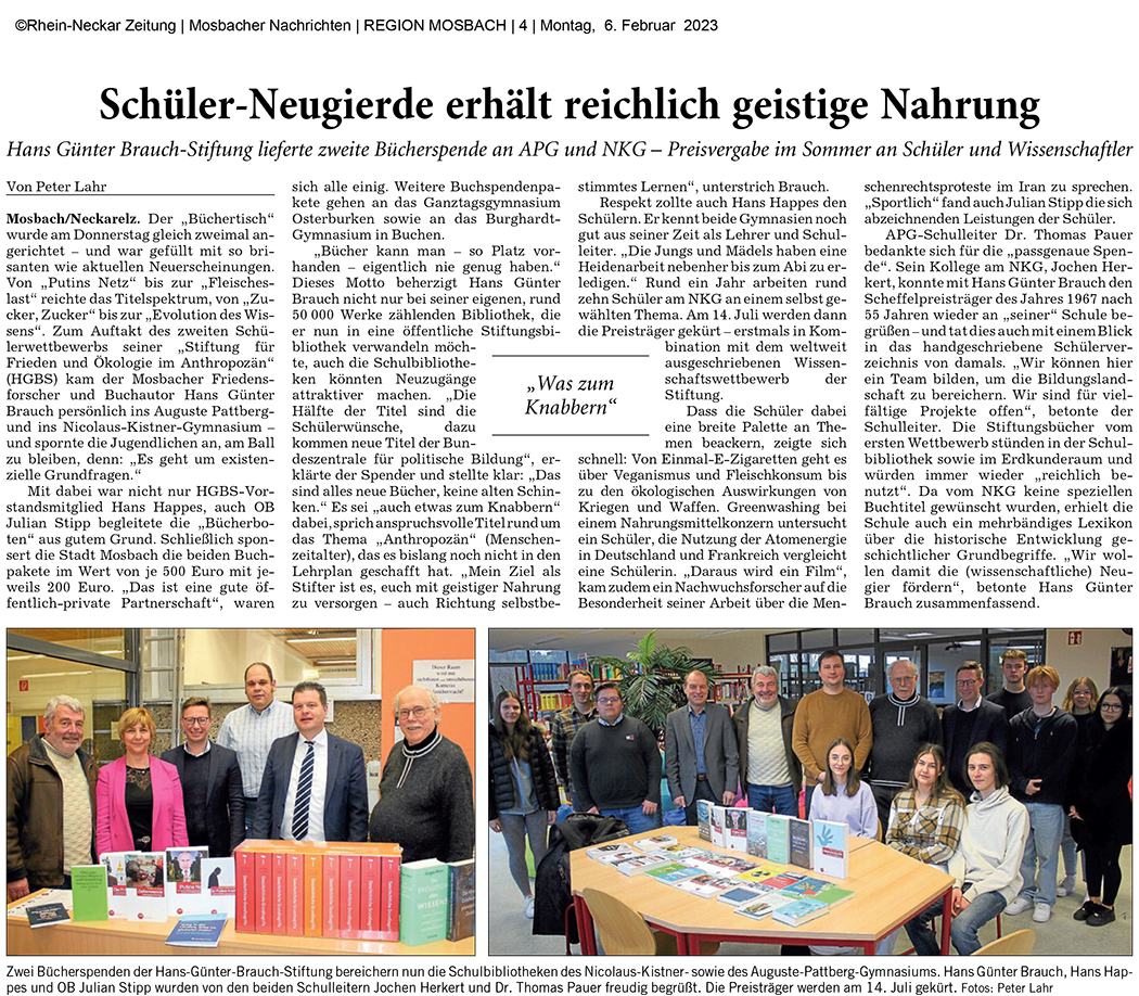 Hans Günter Brauch-Stiftung spendet vier Gymnasien Bücher im Wert von 3000 Euro - Schülerwettbewerb zum Thema Frieden und Ökologie