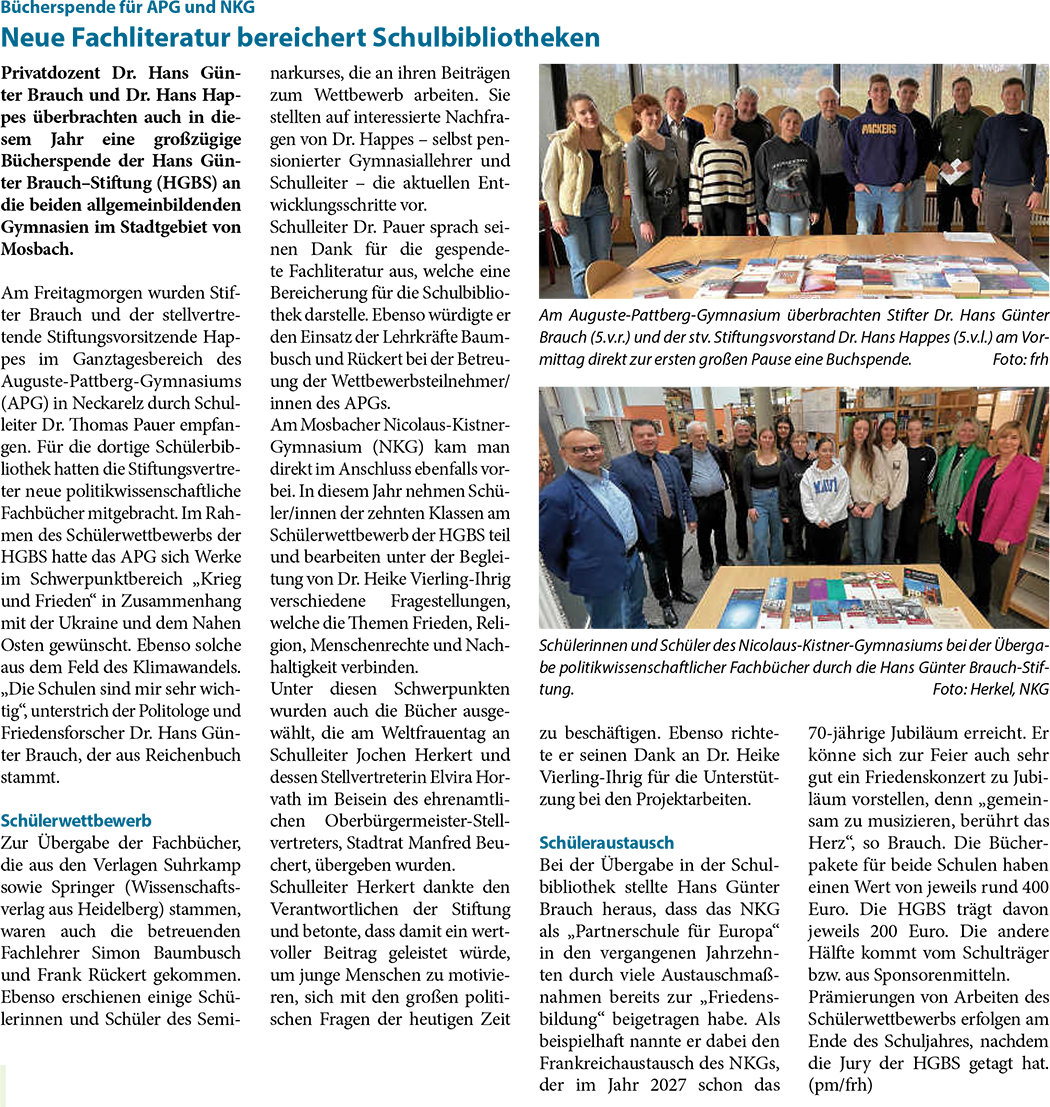 „Hans Günter Brauch Stiftung spendet: Fachbücher sollen Friedensbildung fördern“,