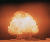 - Die Gefahr eines Atomkrieges seit Beginn des Atomzeitalters mit dem ersten Kernwaffentest (16.7.1945 in Almogordo) und dem Einsatz der beiden ersten Atomwaffen gegen Hiroshima (6.8.1945) und Nagasaki (9.8.1945). Der Systemkonflikt zwischen den USA und der UdSSR führte zu einer bipolaren Weltordnung im Kalten Krieg mit einem Rüstungswettlauf.