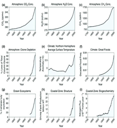 Das internationale Forschungsprogramm zur Geosphäre und Biosphäre (IGBP) stellte seit 1950 eine rapide Zunahme bei ökologischen und sozioökonomischen Trends fest.
