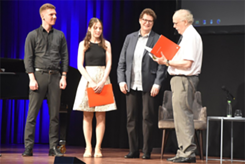 - für das Jahr 2023 am 14. Juli im Rahmen der Verleihung der Schülerpreise 2023 in der Alten Mälzerei an die Musikfachschaft des Auguste-Pattberg-Gymnasiums (APG) (1. Musikstück) und an die Abiturientin Debora Kreß ( 2. Musikstück) für Ihre besonderen Leistungen im Fach Musik als erste Geige im Streichorchester und als Texterin, Komponistin, Sängerin und Gesangssolistin ihres Liedes „Journey of Life“ [Reise des Lebens]
