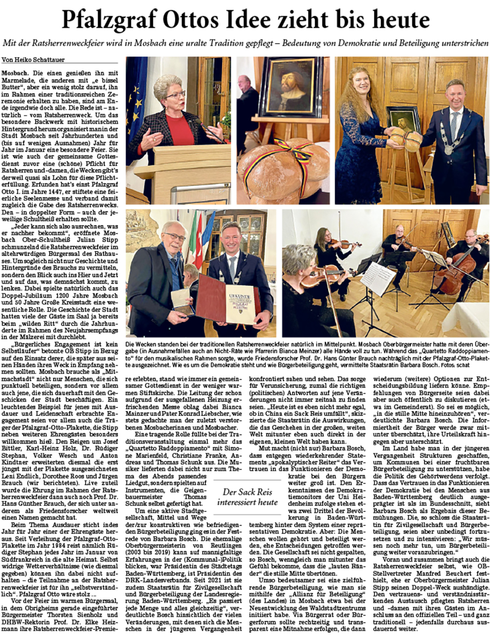 Heiko Schattauer: „Pfalzgraf Ottos Idee zieht bis heute: Mit der Ratsherrenweckfeier wird in Mosbach eine uralte Tradition gepflegt – Bedeutung von Demokratie und Beteiligung unterstrichen“, in: Rhein-Neckar-Zeitung, Montag, 19. Januar 2026, S. 3.